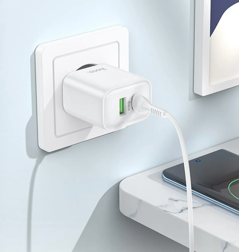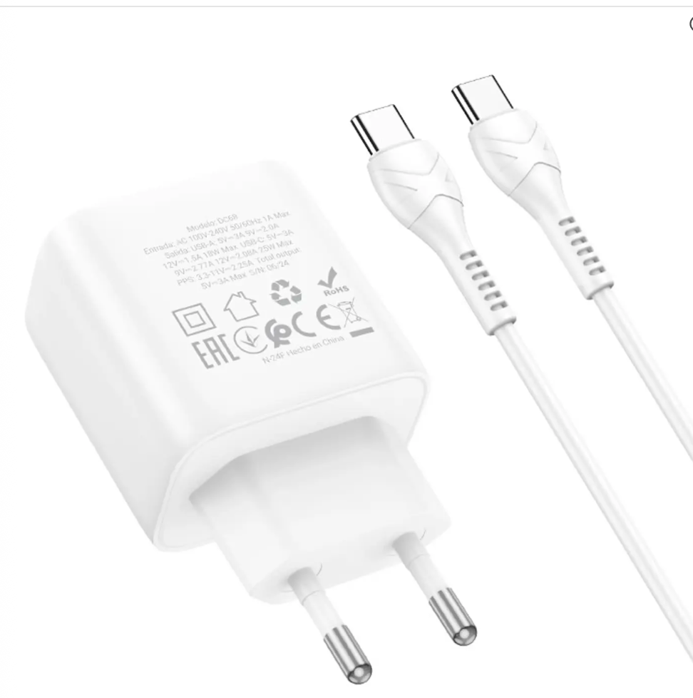 Cargador rápido 25W PD + QC3.0, diseño compacto en color blanco con cable Tipo C a C incluido.